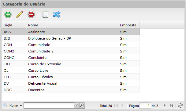 O Catálogo Auxiliar de Categoria do Usuário deverá ser o local de cadastramento da categoria de um determinado grupo de pessoas que atuam dentro de uma empresa ou dentro de uma Instituição de ensino.