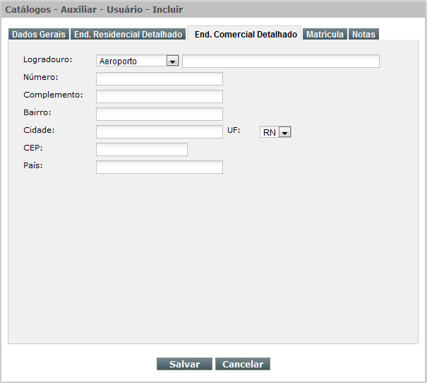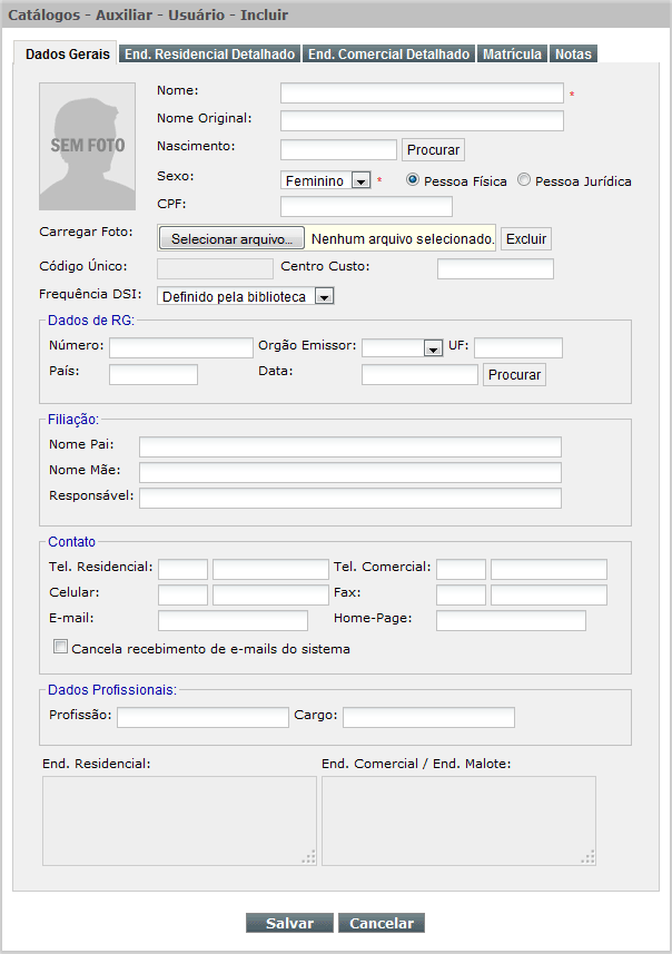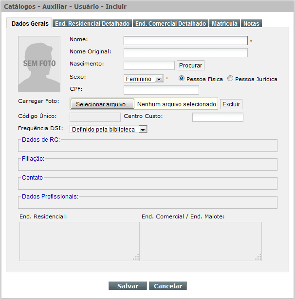 O sistema exibirá uma tela com cinco planilhas de cadastramento de Usuário.