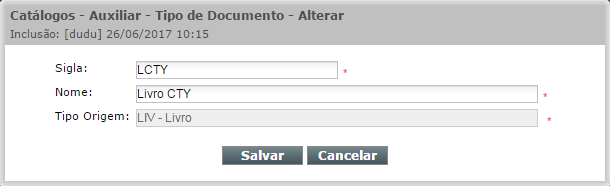 Para alterar um tipo de documento que já exista no Catálogo Auxiliar de Tipo de Documento, selecione-o no grid e clique no ícone