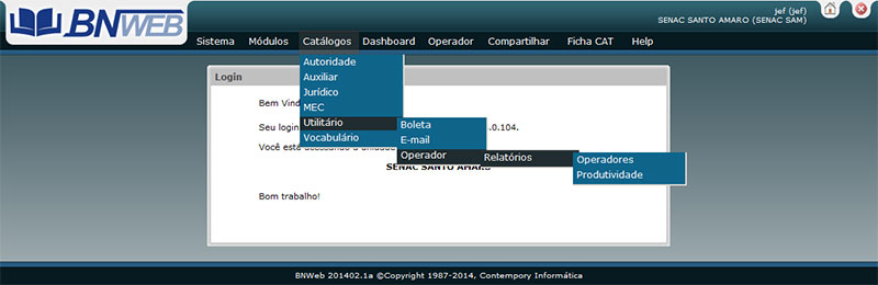 Selecione no Menu Principal do BNWeb, a opção Catálogos, o item Utilitário e escolha o item Operador.