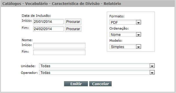 Para emitir um relatório do Catálogo Vocabulário por Característica de Divisão, clique no ícone