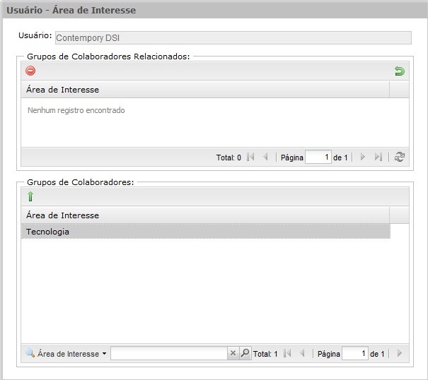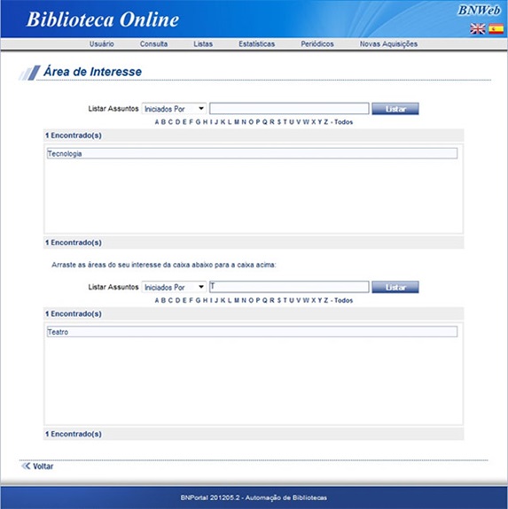 Na tela de cadastramento, o operador indica os assuntos de interesse do usuário e os adicionará a uma lista, clicando no ícone que se encontra na tela. Essa lista também pode ser criada pelo próprio usuário pelo Portal de Consulta.