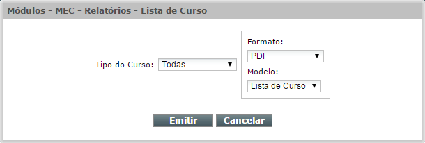 Para emitir esse relatório selecione no Menu Principal do BNWeb, a opção Módulo, item MEC, opção Relatórios, e o item Lista de Curso.