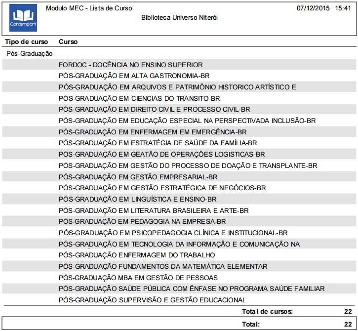 O relatório será apresentado com as seguintes informações: Tipo de curso e um Totalizador na última página.
