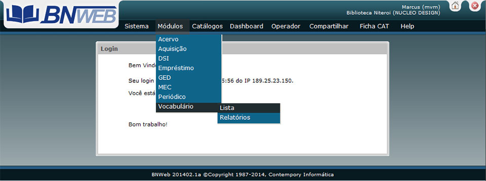 Selecione no Menu Principal do BNWeb, a opção Módulos, o item Vocabulário, opção Lista.