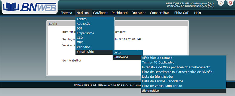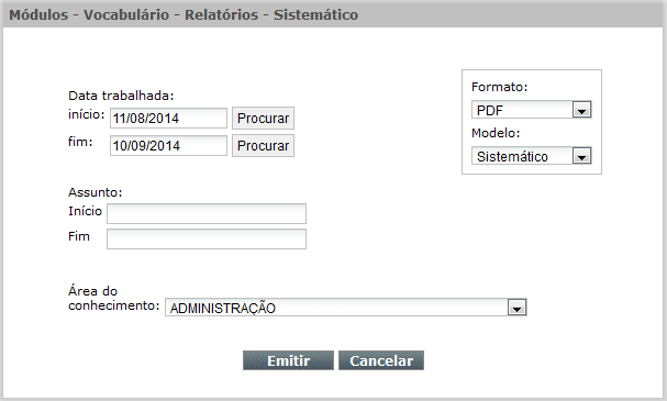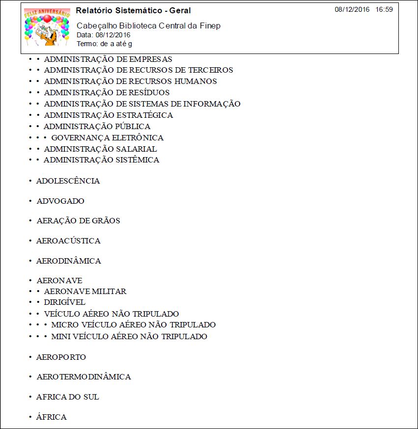 Para emitir esse relatório selecione no Menu Principal do BNWeb, a opção Módulo, item Vocabulário, opção Relatórios, e o item Sistemático.